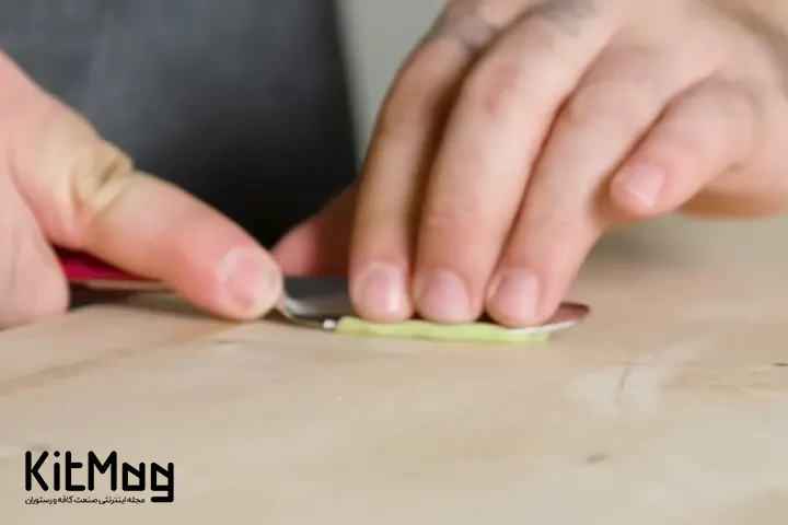 برای تهیه تروفی لازم است خمیر آن را به قطعات کوچکی تقسیم کنید به گونهای که در مرکز کمی ضخیمتر باشد و در دو سر باریک باشد. سپس به کمک کاردک یا انگشت شست، آن را بغلتانید تا یک پیچش زیبا به دست آید.