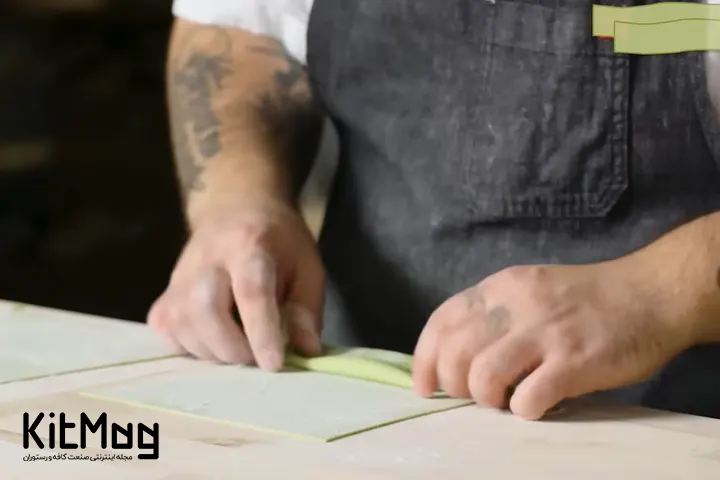 خمیر پاستای جوهر ماهی مرکب را به صورت مستطیلی یکدست پهن کنید و از طرف عرض مستطیل آن را تا کنید. حالا به کمک یک چاقو آن را به قسمت های مساوی برش بزنید. اکنون پاستا فتوچینی شما اماده است.