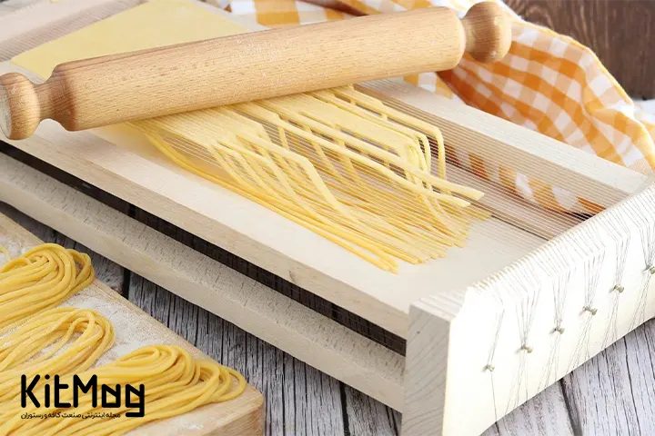 زیر این سیم ها تخته ای چوبی ای قرار دارد که بعد از رد شدن خمیر از سیم ها، رشته های ماکارونی روی آن ریخته میشود و شما میتوانید به صورت کشویی آن تخته را بیرون بیاورید و ماکارونی هارا بردارید.