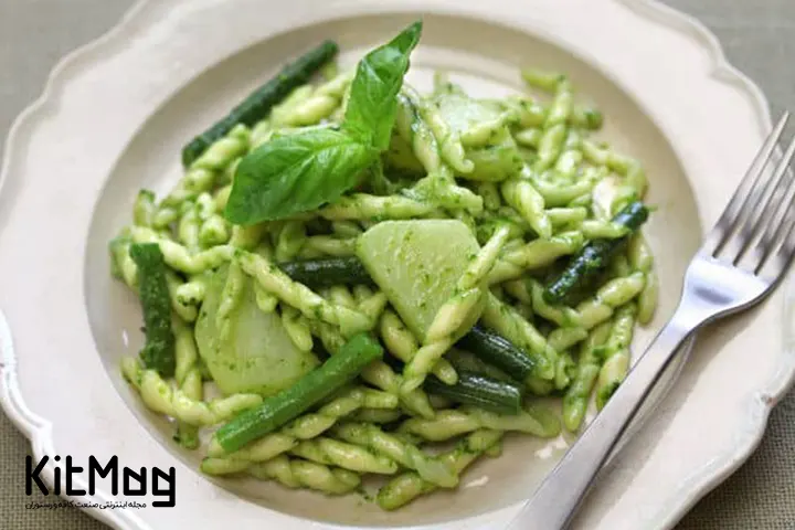 2. پاستا با سس سبز رنگ، که همان پاستا با سس پستو است.