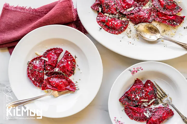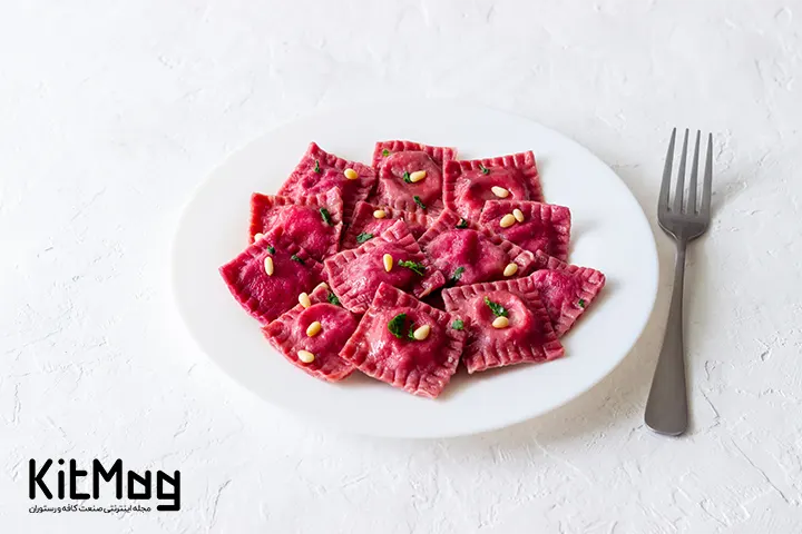 یکی دیگر از مواد اولیه فصل پاییز لبو یا همان چغندر است که رنگی بنفش دارد. در رسپی راویولی چغندر، پوره یا آب چغندر را به خمیر پاستا اضافه میکنیم؛ به همین دلیل راویولیای بنفش با بافتی نرم و سبک به دست میآید.