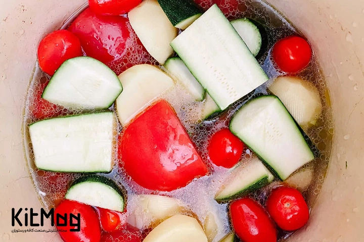 - آنقدر آب (یا آبِ سبزیجات) اضافه کنید که فقط روی سبزیجات را بپوشاند — این نکته بسیار مهم است! اگر آب زیاد باشد، سوپ بیمزه و رقیق میشود. بهتر است سوپ کمی غلیظ باشد. اگر لازم شد، در پایان میتوان کمی آب اضافه کرد.