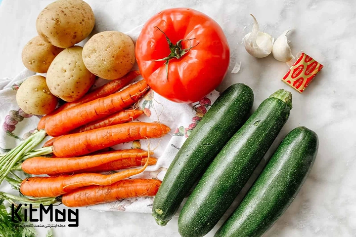 - ابتدا سیبزمینی و هویجها را پوست بگیرید.